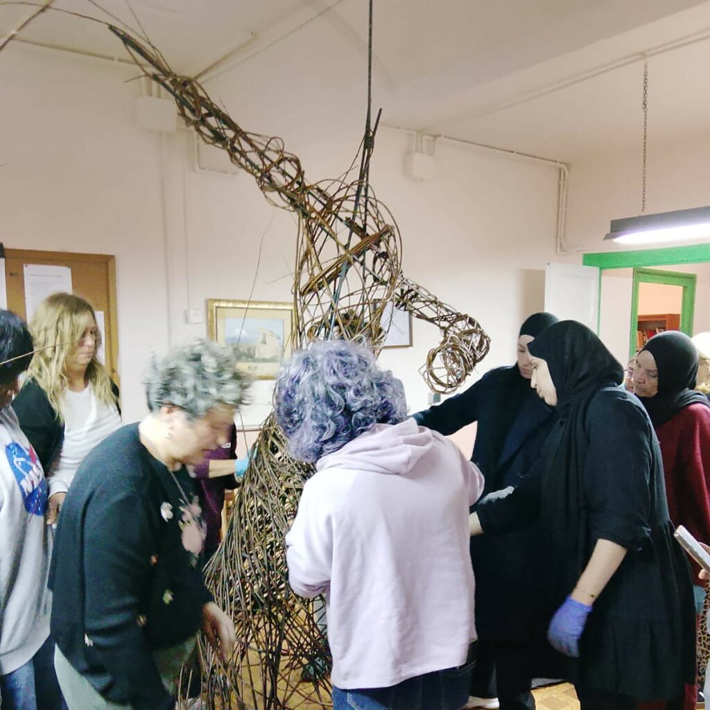 El pasado 6 de noviembre culminamos con un encuentro festivo y con la instalación en Agurain de la escultura construida con mimbre “Mujeres que sostienen el mundo”, un proceso que ha durado varios meses, en el que han participado mujeres atendidas en el PROGRAMA OINEZ (Programa de titularidad del IFBS) de la Cuadrilla de Lautada junto con mujeres de diferentes asociaciones de los municipios de Agurain, Dulantzi y Araia.